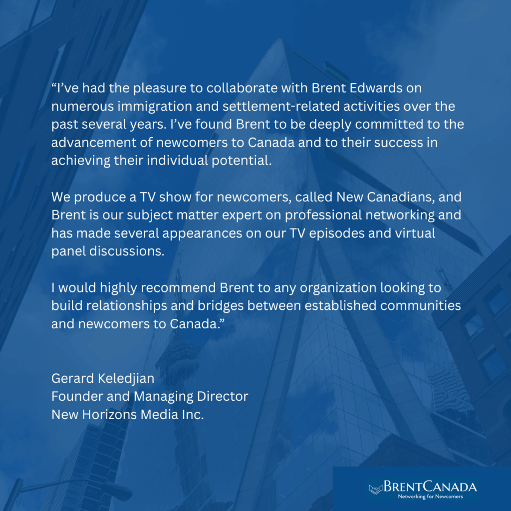 Brent Edwards is passionate about connecting people and opportunities. He has helped newcomers to Canada achieve their career potential by coaching professional networking skills and leading workshops on Canadian business culture. A sought-after speaker on networking topics, he has served as a mentor with the Toronto Region Immigrant Employment Council and volunteered with The Institute for Canadian Citizenship. Brent also shares his expertise as a subject matter expert on professional networking for New Canadians TV.