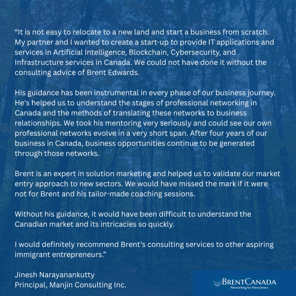 BrentCanada Experiences coaches business professionals who are new to B2B relationship-building responsibilities on how to leverage their existing skills to succeed in Canadian markets.